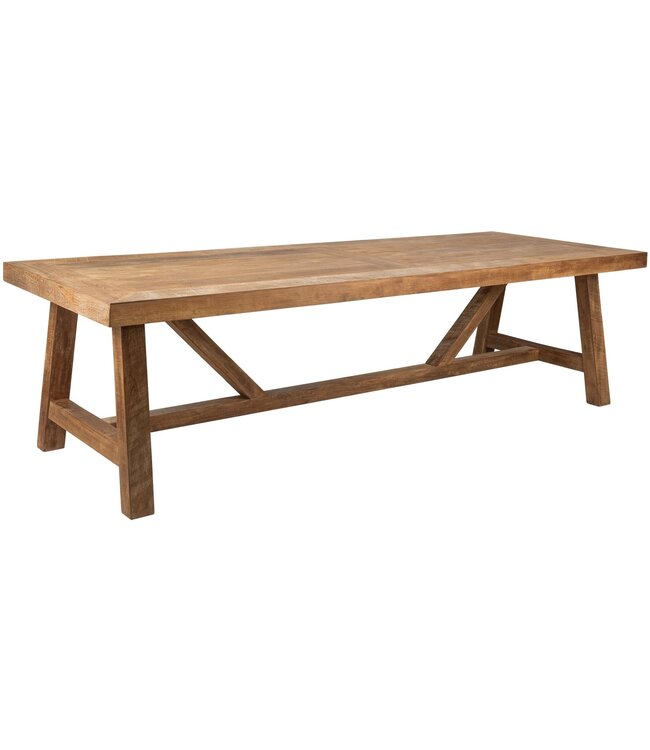 Let bij deze tafel ook op het gave lijnenspel van het massief houten onderstel. De poten hebben een A-lijn. De onderbalk is verstevigd met schuine balken voor extra stabiliteit en een mooi accent aan de vorm. Prachtig als je lekker de ruimte hebt voor een grote tafel.
