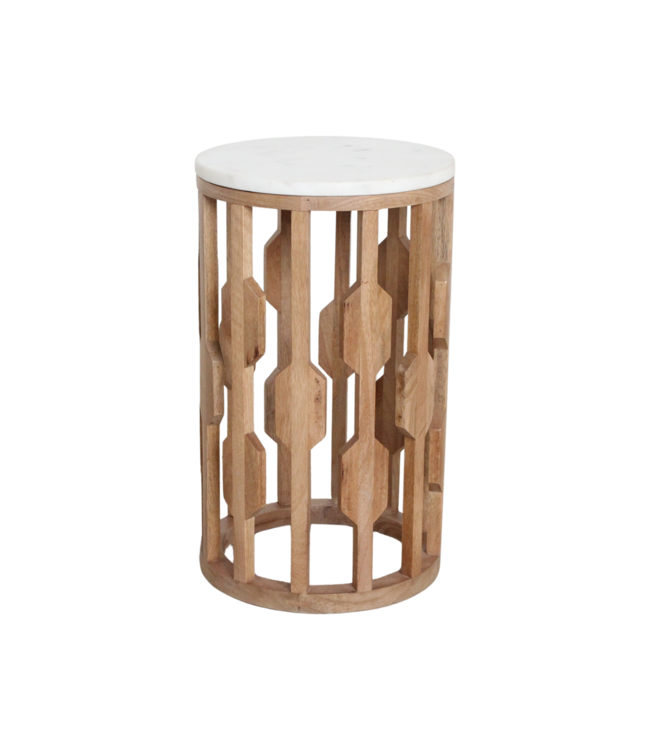 Het warme mangohouten onderstel geeft de tafel een zachte, natuurlijke uitstraling en zorgt voor een mooi contrast met het koele marmer. Het hout is afkomstig van mangobomen die na hun vruchtperiode een tweede leven krijgen: stijlvol én verantwoord.