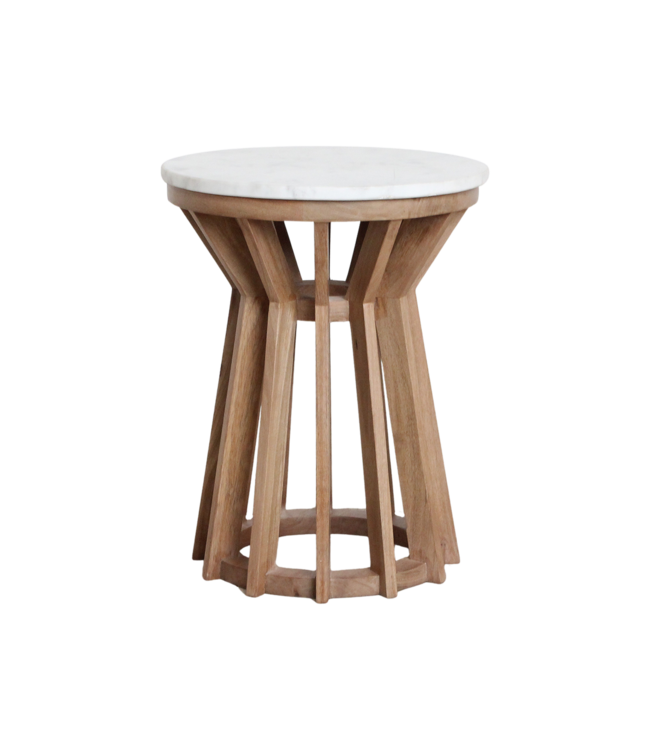 Het ronde blad is gemaakt van massief wit marmer: glad, koel en tijdloos — met subtiele grijs-beige aders die elke tafel uniek maken. Geen Sarawak is hetzelfde, en juist dat maakt ‘m zo bijzonder.