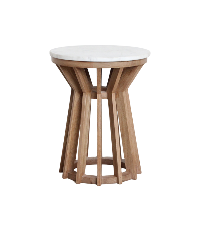 Het ronde blad is gemaakt van massief wit marmer: glad, koel en tijdloos — met subtiele grijs-beige aders die elke tafel uniek maken. Geen Sarawak is hetzelfde, en juist dat maakt ‘m zo bijzonder.