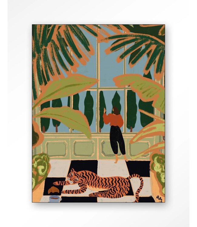 Green House is een speelse, op de natuur geïnspireerd kunstwerk dat levendige kleuren en een vrolijke charme aan je huis toevoegt. In deze eigentijdse wanddecoratie, met een tijger die geniet van thee en croissants in een kas, legt kunstenares Arty Guava de balans tussen natuur en leven vast.